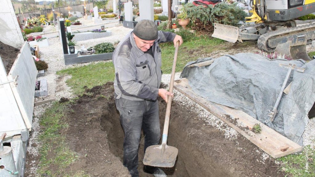 Auf die Frage, was das Wichtigste ist, das ein Totengräber können muss, meint er: „Körperlich gut beisammen sein.“ Denn nur ein Drittel der Gräber in Gramastetten können mit dem Bagger ausgehoben werden. Für ein Grab schaufelt er ungefähr vier bis fünf Stunden. Ebenso das Improvisieren sei wichtig bei diesem Job. Denn der Untergrund am Friedhof ist ganz unterschiedlich. Manchmal steht beim oder nach dem Schaufeln das Wasser in der Grube. Ein sogenanntes Tiefgrab mit 2,3 Metern Tiefe ist dann nicht möglich.