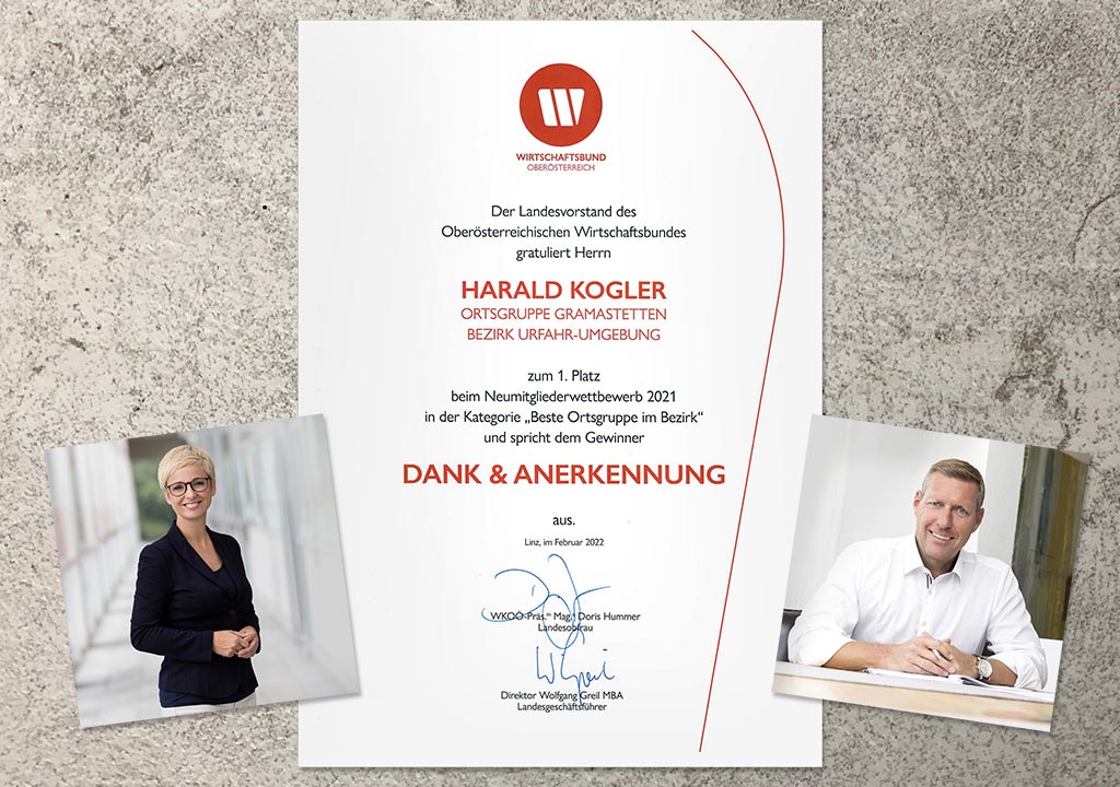 Der Landesvorstand des OÖ Wirtschaftsbundes gratuliert Harald Kogler und seinem Team zum 1. Platz beim Neumitgliederwettbewerb 2021 in der Kategorie „Beste Ortsgruppe im Bezirk„. Als Dankeschön gibt es € 500,- zur Verwendung als Guthaben für Aktivitäten und Veranstaltungen der Ortsgruppe Gramastetten.