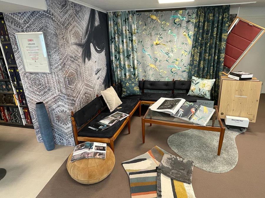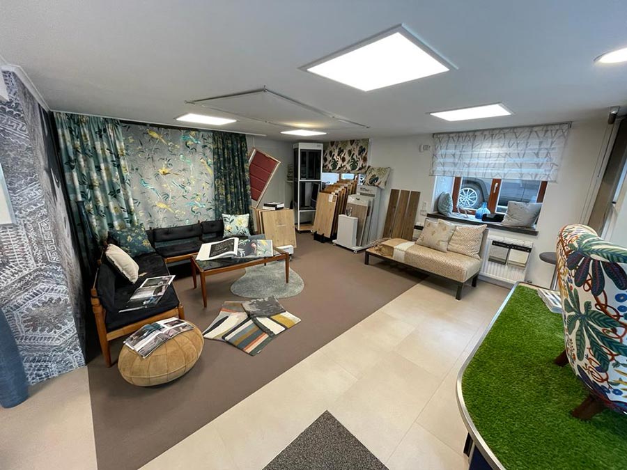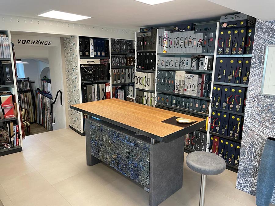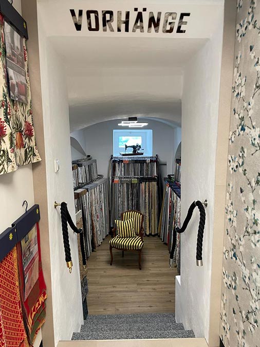Der Schauraum bzw. Ausstellung mitten in der Marktstraße in Gramastetten ist auf den ersten Blick sehr klein und überschaubar. Der erste Eindruck irrt aber, denn man findet schön übersichtlich und sehr strukturiert unzählige Stoff-, Tapeten- und Vorhangmuster für jeden noch so ausgefallenen Geschmack.