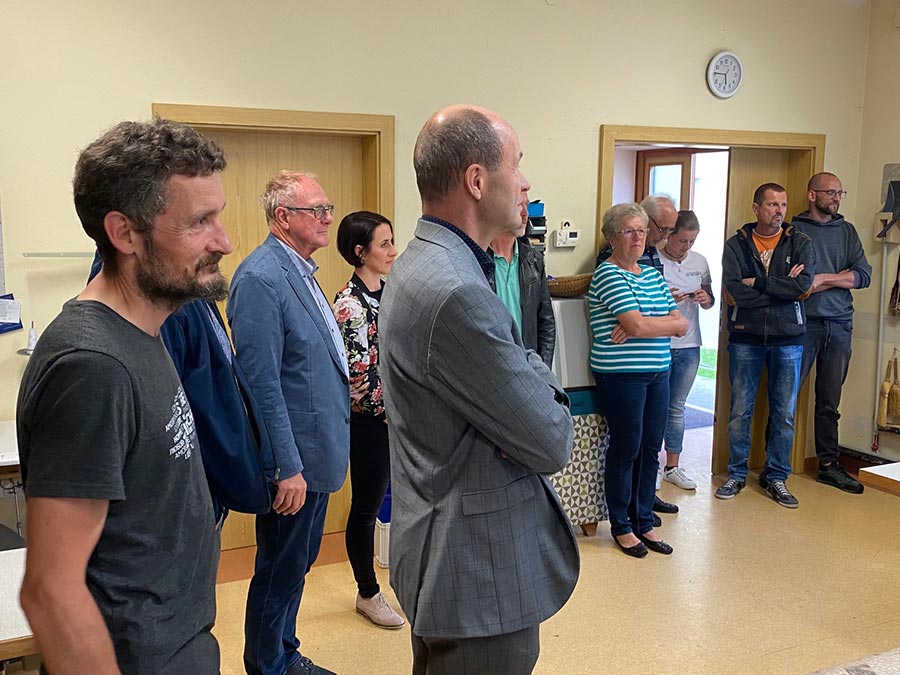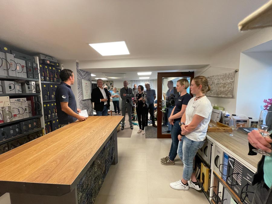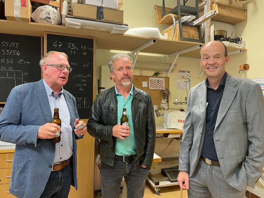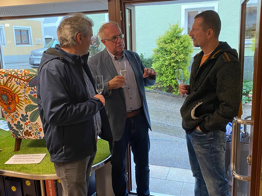 Nach Sektempfang und geschichtlicher sowie inhaltlicher Vorstellung des Betriebes im Schauraum wechselten wir in die Werkstatt, die Gerhard mit seinem Vater bereits gemeinsam gebaut hat. Alois und Margarete Dumfart haben den Betrieb 2013 an Gerhard übergeben. Auf die Frage ob es da Generationskonflikte gegeben hat kam von beiden Seiten ein klares „Nein!“. Sowohl Vater als auch Sohn sprachen sehr respektvoll und mit lobenden Worten übereinander. Vater Alois und Mutter Margarete war es wichtig, dem Sohn die Berufswahl selbst entscheiden zu lassen und das Gerhard seine Ideen in den Betrieb selbstständig einbringen konnte.