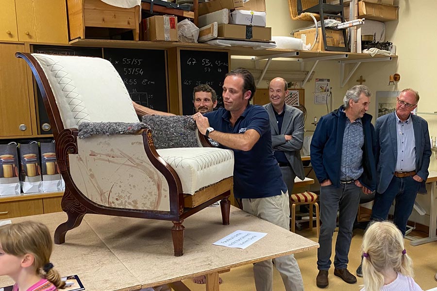 Sessel, die über hundert Jahre alt sind, stehen in der Werkstatt vom Raumausstatter Dumfart. Sie werden in Zusammenarbeit mit Tischlern neu überarbeitet, tapeziert und vielleicht sogar mit einem frischen, neuen Stoff in das aktuelle Jahrhundert geholt. Hier wird einem wieder mal bewusst, wie schnelllebig unsere Zeit geworden ist und wie sehr wir darauf „trainiert“ worden sind, dass Möbelstücke günstig zu jederzeit verfügbar sind und diese oft nach kurzer Zeit einfach wieder ausgetauscht werden.