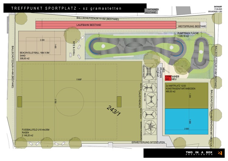 Geplant sind ein Pumptrack, ein Beachvolleyballplatz, eine moderne Calisthenics-Anlage sowie gemütliche Bereiche zum Verweilen. Zudem bleibt eine großzügige Grünfläche mit rund 60 Metern Länge bestehen – ideal für ein U10-Fußballfeld, Schlagball oder Leichtathletik.