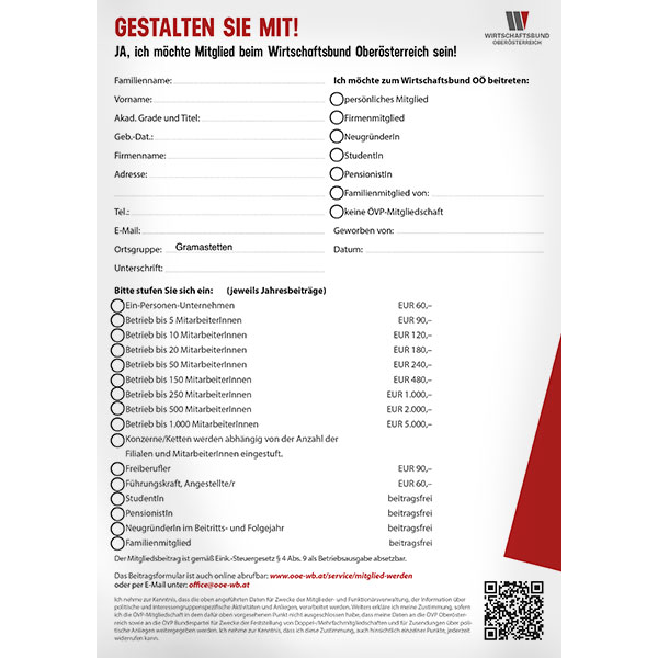pdf downloaden, ausdrucken und an info@gramastetten-wb.at schicken oder direkt auf der Website des Wirtschaftsbund OÖ ausfüllen.